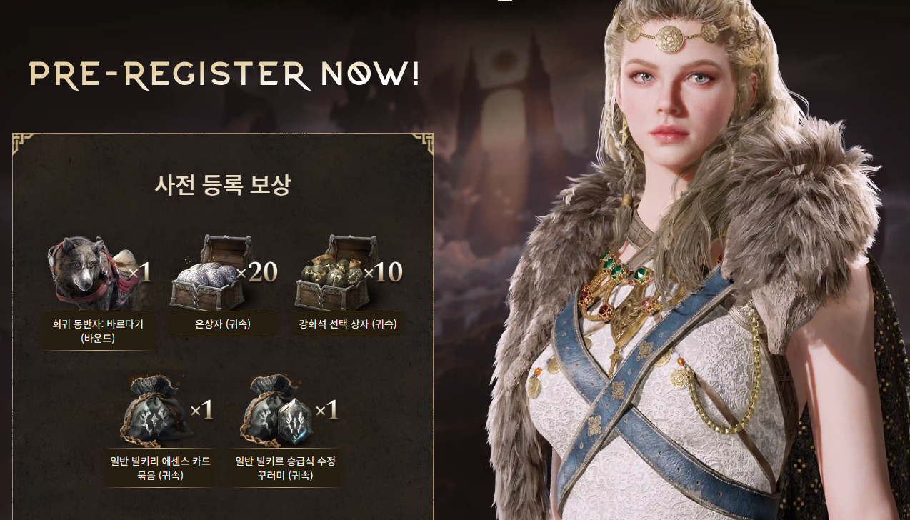 - 공식 사이트에서 참여 시 '희귀 동반자: 바르다기'와 '발키리 정수 카드 꾸러미'를, 위믹스 플레이에서 참여 시 '희귀 동반자: 굴른코르프'와 '디시르 정수 카드 꾸러미'를 각각 획득합니다.