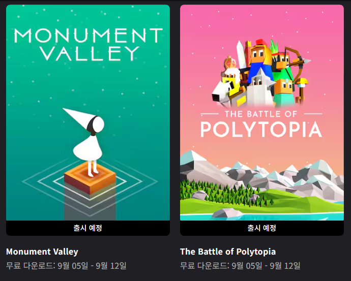 다음 주 에픽게임즈 무료 배포 게임은 '모뉴먼트 밸리(Monument Valley)'와 '더 배틀 오브 폴리토피아(The Battle of Polytopia)'입니다. '모뉴먼트 밸리'는 초현실적인 건축물과 착시를 이용한 감각적인 퍼즐 게임이며, '더 배틀 오브 폴리토피아'는 귀여운 도트 그래픽의 부족을 이끌고 영토를 확장하는 턴제 전략 게임입니다. 다음 주에도 에픽게임즈의 풍성한 무료 배포 혜택을 기대해 보세요.