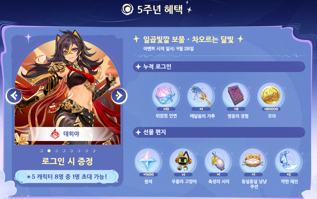 이번 업데이트는 원신 5주년을 기념하여 다양한 혜택이 제공됩니다. 누적 로그인 이벤트를 통해 듀얼킹 인연 10개와 깨달음의 가루 1개를 획득할 수 있으며, 우편함을 통해 원석 1,600개도 지급됩니다. 버전 첫 주에는 캐릭터 육성 재료의 요일별 입장 제한이 해제되어 새로 획득한 캐릭터의 빠른 육성이 가능합니다.