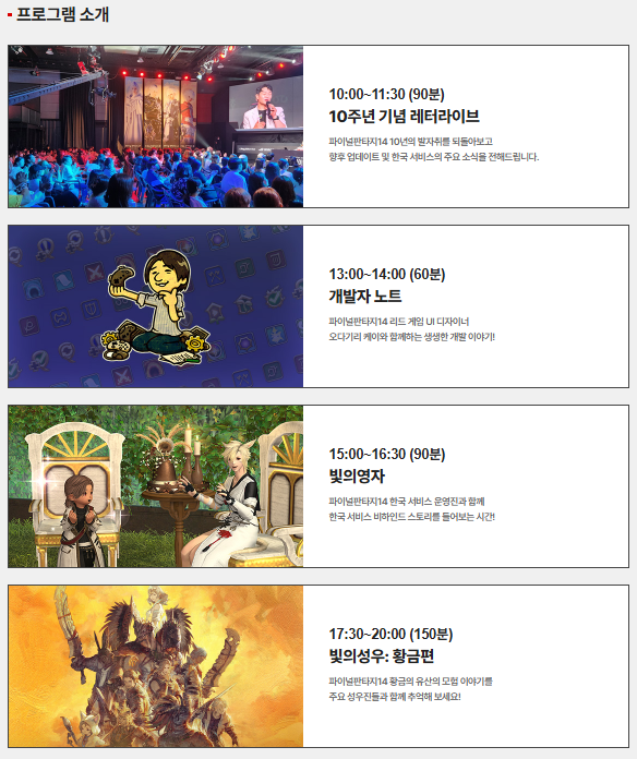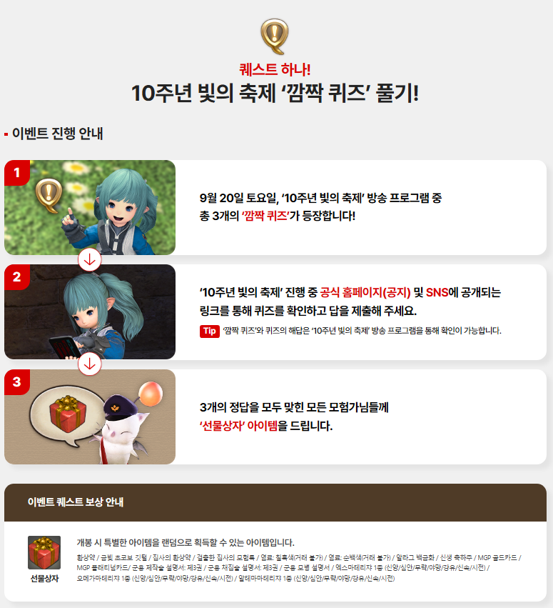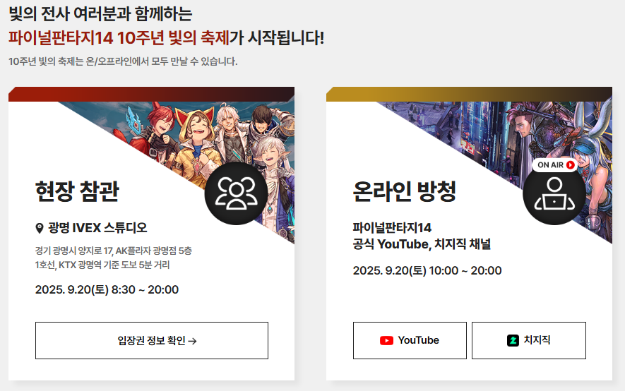 올해는 파이널판타지14 한국 서비스가 시작된 지 꼭 10년이 되는 해입니다. 긴 세월 동안 수많은 모험가들과 함께 성장해 온 만큼, 이를 기념하는 특별한 빛의 축제가 곧 열리는데요. 9월 20일 하루 동안 광명 IVEX 스튜디오에서 오프라인 행사와 함께 공식 유튜브, 치지직 채널을 통한 온라인 방송까지 준비되어 있어 많은 유저들이 손꼽아 기다리고 있습니다.