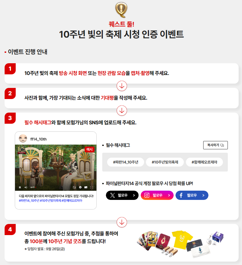 두 번째는 시청 인증 이벤트입니다. 방송 시청 화면이나 현장 사진을 찍어 SNS에 필수 해시태그와 기대평을 작성해 업로드하면 응모가 완료됩니다. 총 100명을 추첨해 10주년 기념 굿즈가 지급되는데, 이미 예약 판매가 종료된 상품이라 이번 기회를 놓치면 다시 얻기 어렵습니다. 공식 계정을 팔로우하면 당첨 확률이 올라간다는 점도 잊지 마세요.