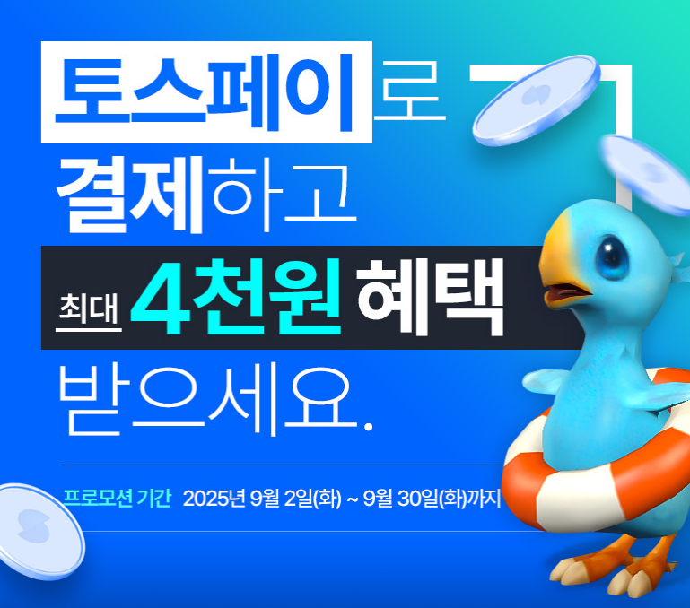 또한 토스페이 결제 프로모션도 진행 중입니다. 9월 30일까지 토스페이로 결제 시 최대 4천 원 혜택을 받을 수 있으며, 신규 사용자라면 추가 적립 혜택까지 누릴 수 있어 알뜰하게 이용권을 구매할 수 있습니다.