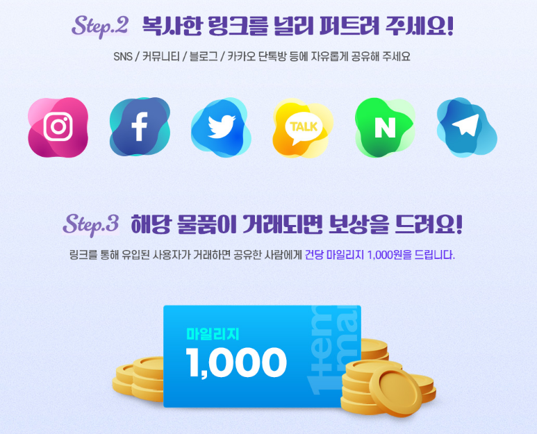 - STEP 2: 복사한 링크를 페이스북, 인스타그램, 블로그 등 다양한 채널에 공유합니다. 구매자는 반드시 공유된 링크를 통해 구매를 신청해야 합니다.