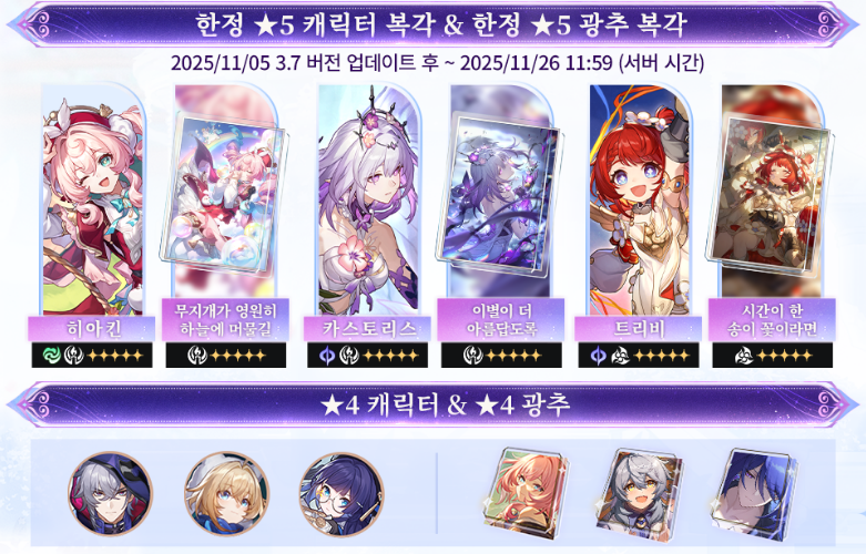 이번 3.7 버전 픽업 일정은 조금 독특하게 진행됩니다. 신규 캐릭터 키레네는 버전 시작일인 11월 5일부터 12월 16일 15시까지, 버전 기간 내내 픽업 워프에 등장합니다. 이는 유저들에게 키레네 획득에 충분한 시간을 제공하려는 것으로 보입니다.