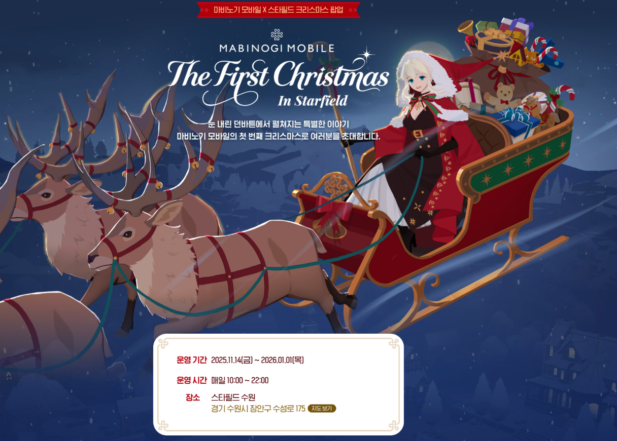 올해 겨울, 마비노기 모바일이 첫 크리스마스를 맞아 특별한 오프라인 이벤트를 준비했습니다. 바로 스타필드 수원 1층에서 진행되는 마비노기 모바일 크리스마스 팝업스토어입니다.