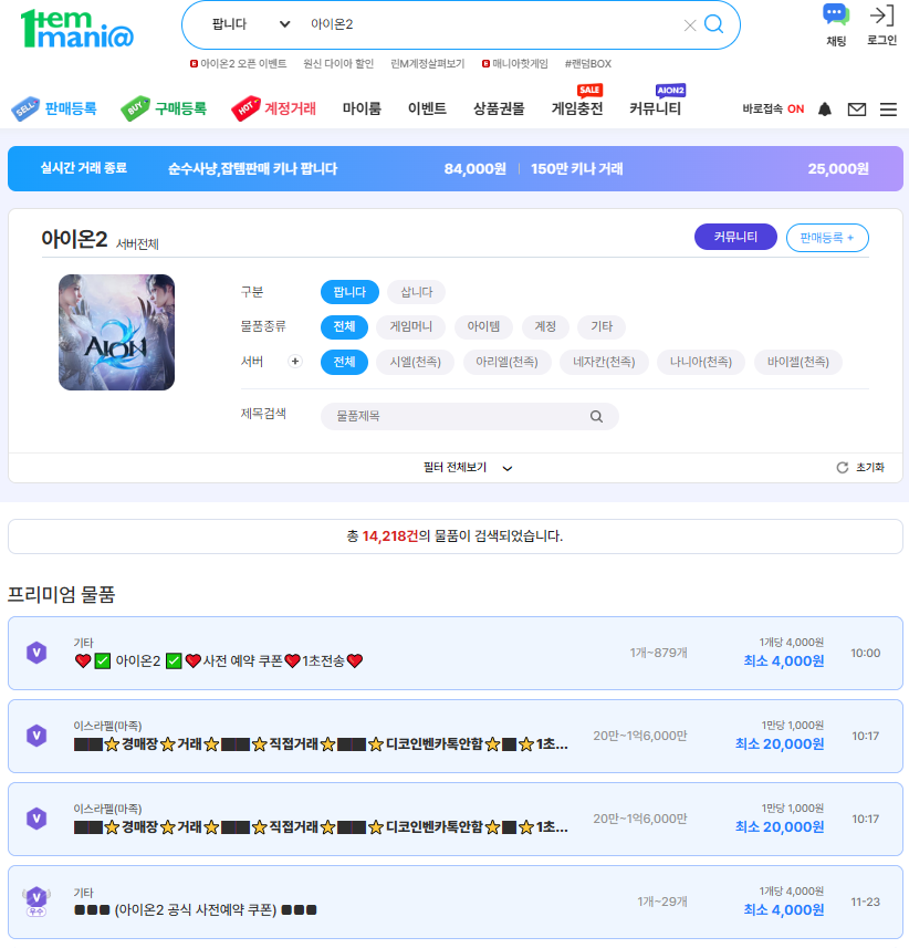 아이온2 계정거래 아이템거래 등 다양한 거래가 활발하게 이루어지고 있는데요 어떤 거래들이 이루어지고 있는지 궁금하시다면 아래 배너를 클릭해주시면 아이템매니아 공식 홈페이지로 바로보실수 있습니다!