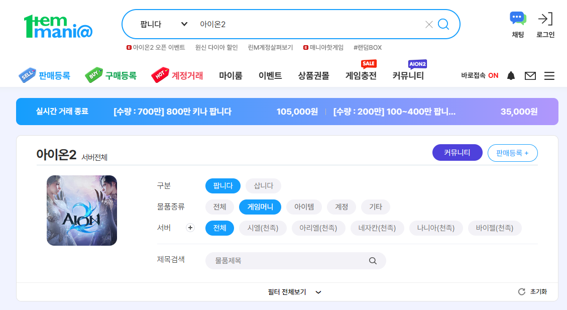 아이온2 계정거래 아이템거래 등 다양한 거래가 활발하게 이루어지고 있는데요 어떤 거래들이 이루어지고 있는지 궁금하시다면 아래 배너를 클릭해주시면 아이템매니아 공식 홈페이지로 바로보실수 있습니다!