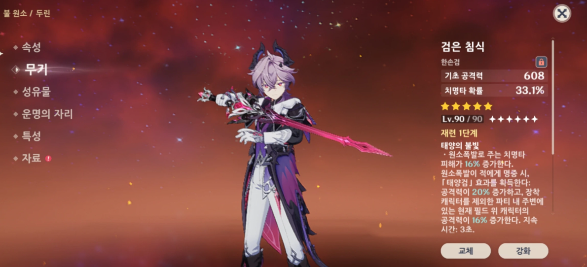 두린은 서브 딜러이지만 원소 폭발의 딜 비중이 높아 무기 선택에 따라 파티 화력이 크게 달라집니다. 전용 무기인 검은 침식이 최고의 효율을 보이지만, 5성 범용 무기들도 훌륭한 대체제가 될 수 있습니다.