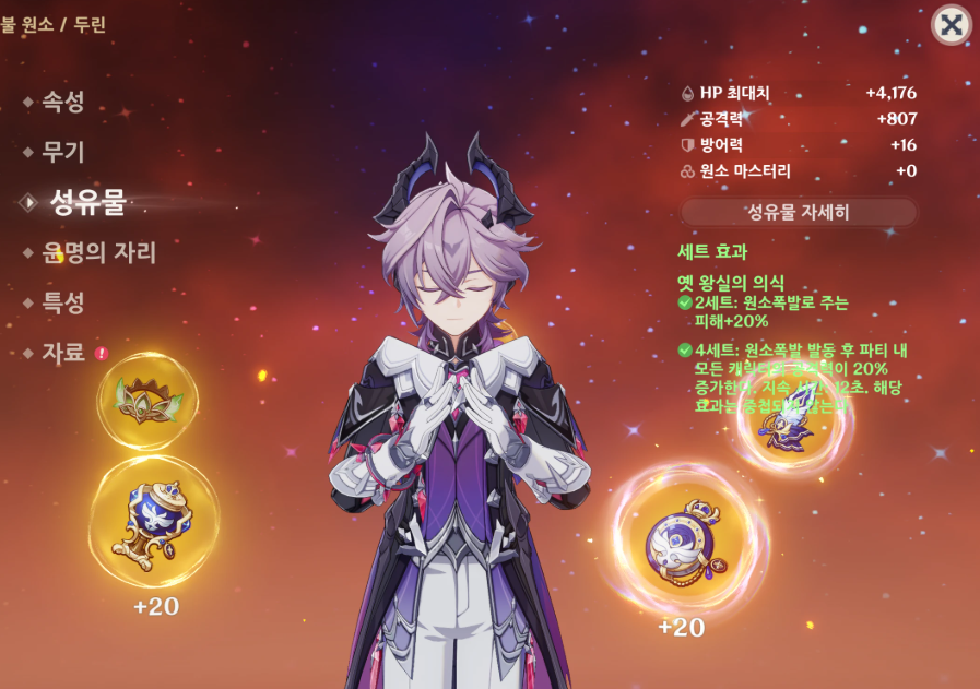 두린은 원소 폭발 의존도가 절대적이므로, 원소 충전 효율(원충)과 폭발 피해를 동시에 확보하는 성유물 세팅이 정석입니다.