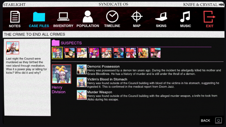Paradise Killer는 흔히 볼 수 있는 액션 중심 게임이 아니다. 이 작품은 스토리와 수사, 탐험에 모든 초점이 맞춰진 오픈월드 추리 어드벤처다. 플레이어는 현실과는 단절된 섬 ‘파라다이스’에서 발생한 대규모 살인 사건을 조사하게 되며, 주인공은 유배지에서 소환된 수사관 레이디 러브 다이스다.