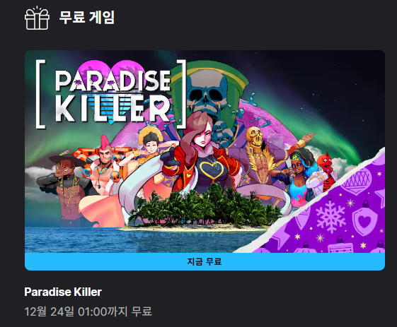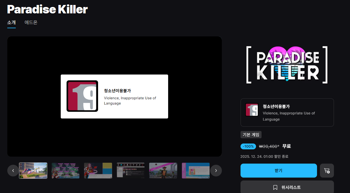 에픽게임즈 스토어에서 2025년 연말 무료 배포 이벤트의 여섯 번째 타이틀로 Paradise Killer가 공개됐다. 수령 가능 기간은 12월 24일 오전 1시까지로, 해당 시간 이전에 라이브러리에 추가하면 영구 소장이 가능하다. 기존에도 평이 좋았던 작품이지만, 에픽게임즈에서 무료로 제공되는 것은 이번이 처음이라 추리 게임을 좋아하는 유저라면 특히 주목할 만하다.