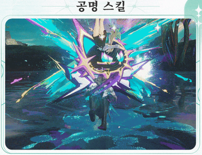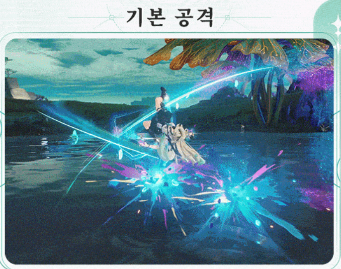 일반적인 전투 사이클: 변주 스킬 진입 후 공명 해방(R)을 먼저 사용하고, 공명 스킬(E)과 일반 공격 차지(평꾹)를 이어갑니다. 이후 점프 3회와 낙하 공격으로 마무리하여 반주 버프를 넘겨주는 것이 기본입니다.