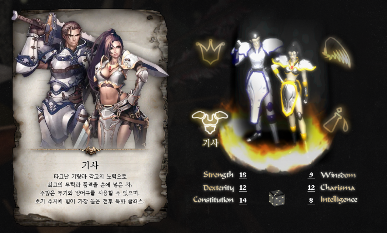 - 기사: 근거리 전투 특화 클래스, 파티의 전면을 담당