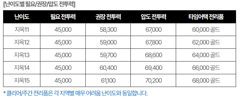상위 난이도 입장을 위해서는 이전 단계 난이도를 타임어택으로 클리어해야 하며, 파티 단위의 숙련도가 중요해진다. 요구 전투력은 동일하지만 권장·압도 전투력은 단계별로 크게 상승하므로, 무리한 도전보다는 준비 후 도전이 권장된다.