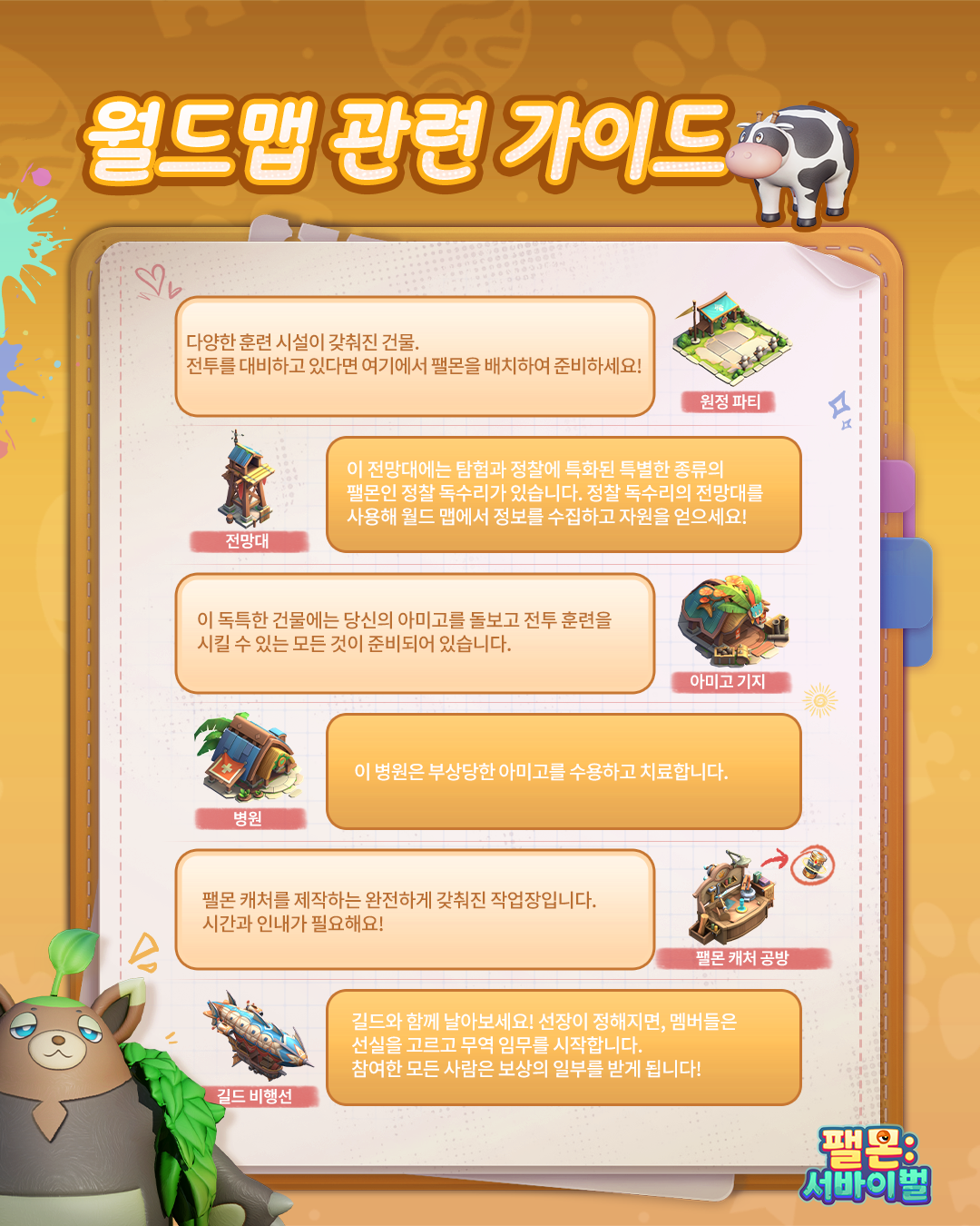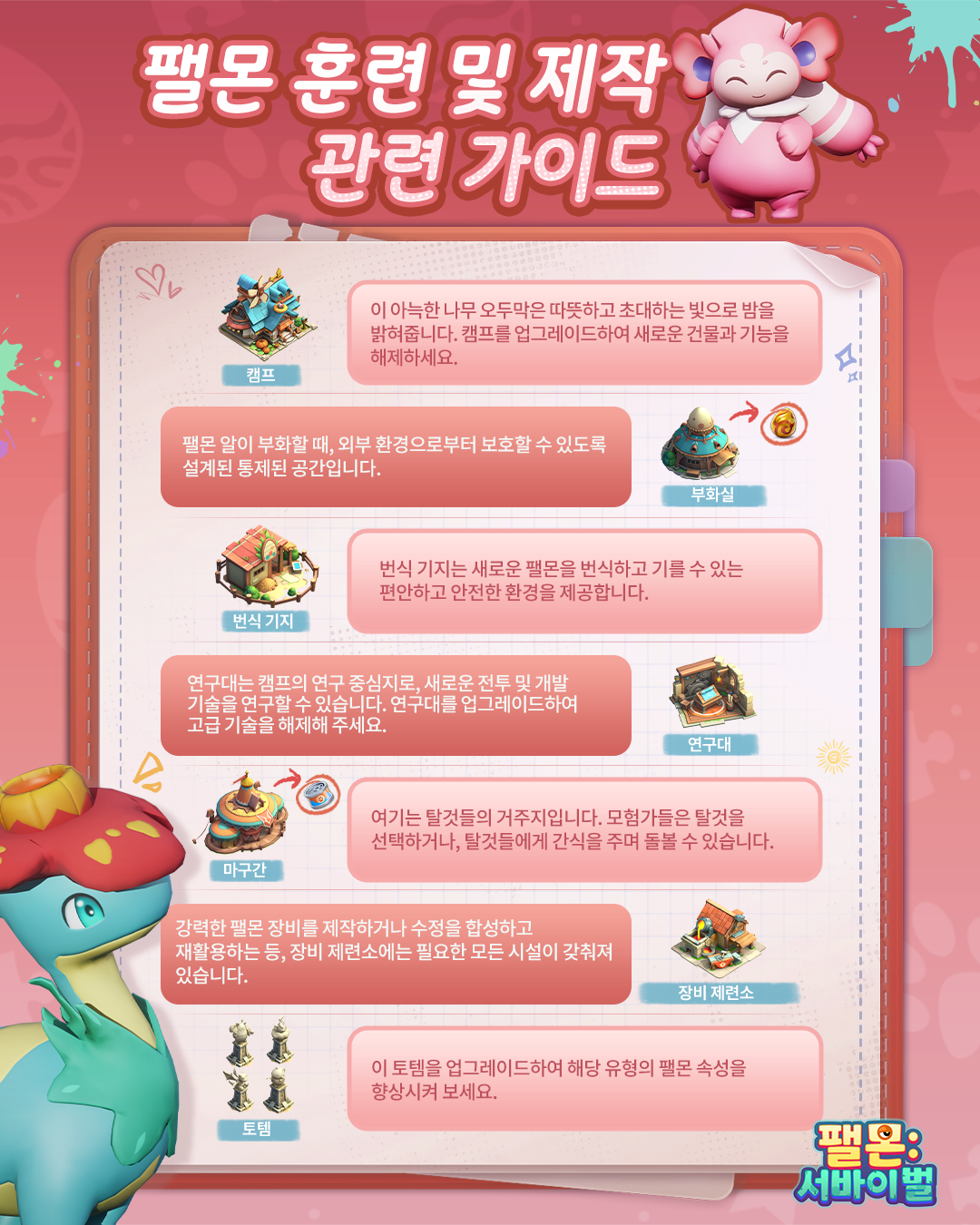 세 번째: 자원 생산 시설 및 연구소 목재, 돌, 식량 등을 생산하는 시설과 기술을 연구하는 연구소가 그 다음입니다. 여기서 중요한 팁은 각 건물에 건설 시간 단축 특성을 가진 팰몬을 적절히 배치하는 것입니다. 효율적인 배치는 전체적인 성장 속도를 비약적으로 높여줍니다.