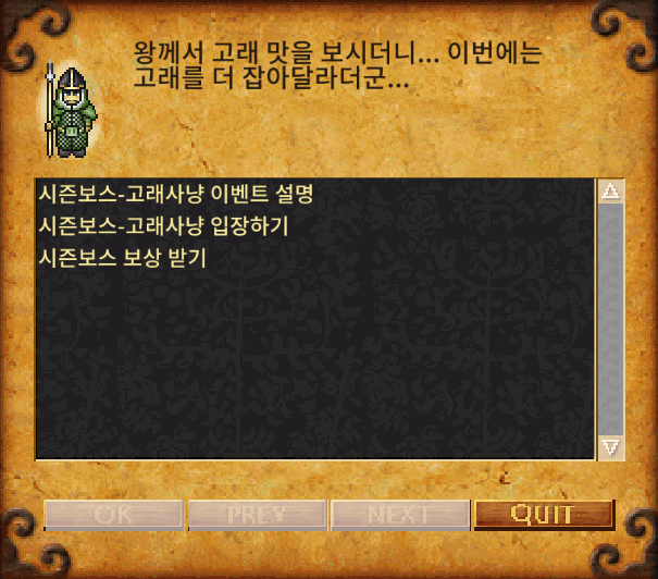 바람의나라 클래식에 접속하는 모든 유저가 혜택을 받을 수 있는 기본 이벤트입니다. 주막에 있는 특정 NPC를 통해 진행 상황을 확인할 수 있어 접근성이 매우 높습니다.