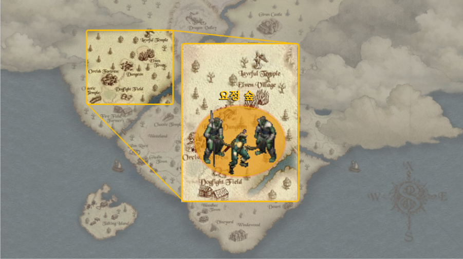 요정 숲 필드: 요정 종족에게 특화된 곳으로, 텔레포트 투 마더 마법을 통해 정비가 매우 빠릅니다. 각종 오크 시리즈가 드랍하는 토템들을 모아 아데나를 수급하는 것이 육성의 기본입니다.