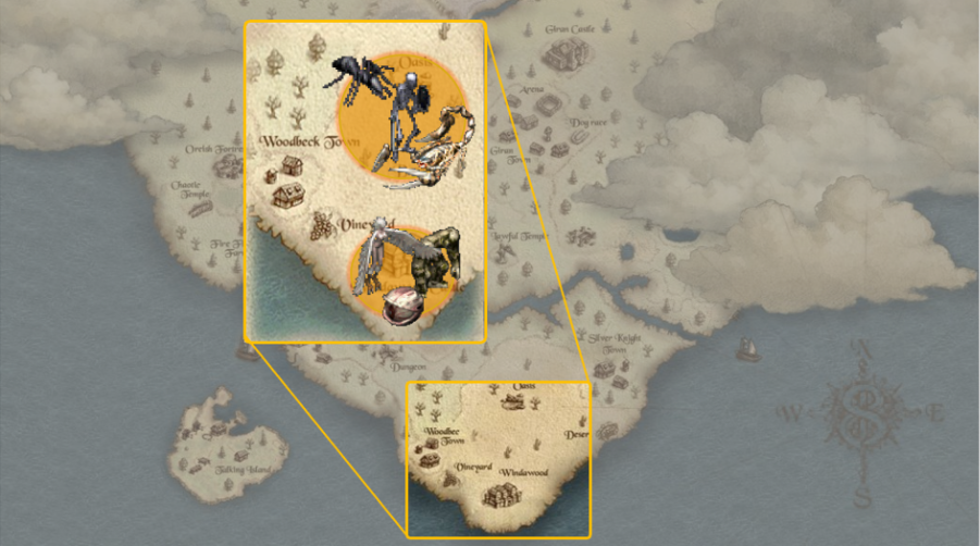 윈다우드 사막: 선공 몬스터가 많아 긴장감을 늦출 수 없는 곳입니다. 중앙 오아시스를 거점으로 거대 개미를 사냥해 마법의 투구: 치유를 노려보세요.