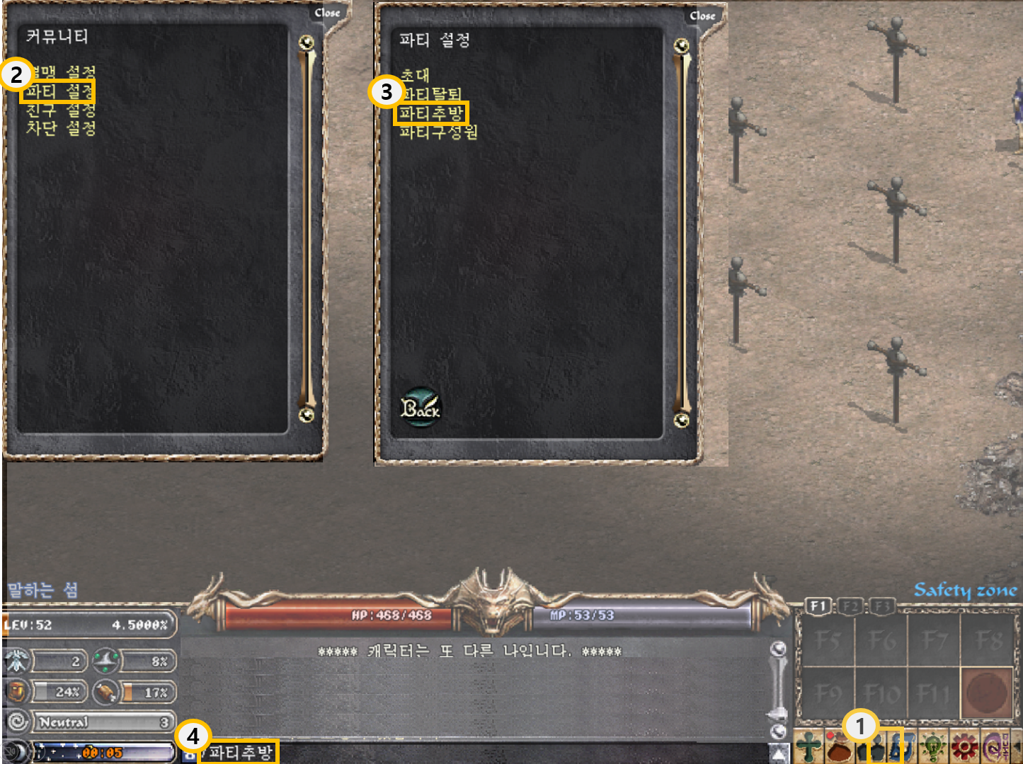 드래그 기능: 가장 직관적인 방법으로, 초대할 캐릭터를 마우스 우클릭한 상태에서 노출되는 이름을 내 캐릭터의 HP/MP 바 쪽으로 드래그하면 즉시 초대가 발송됩니다.