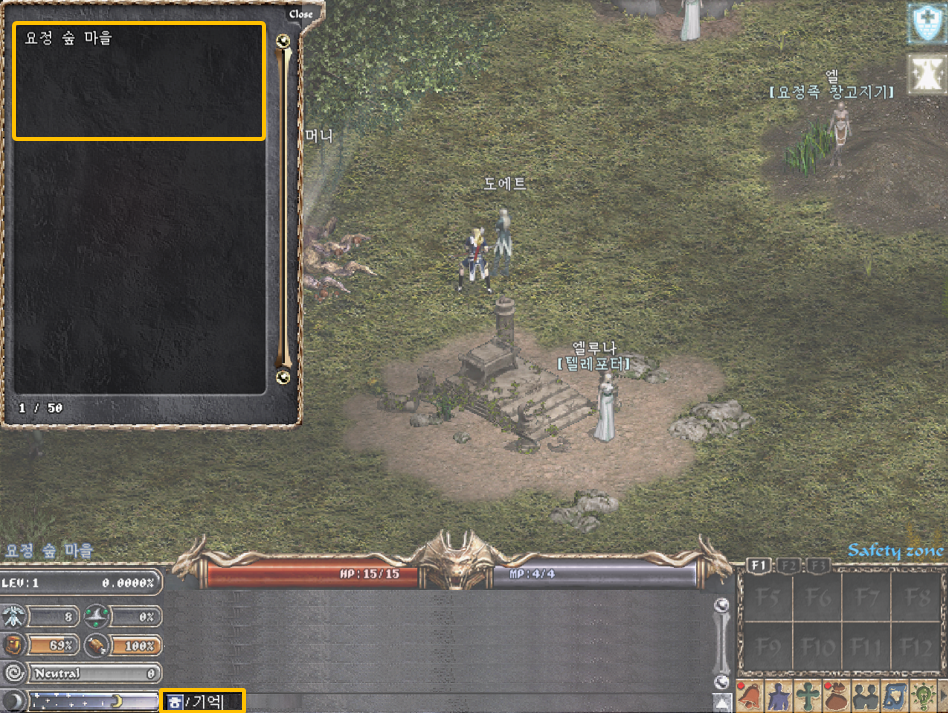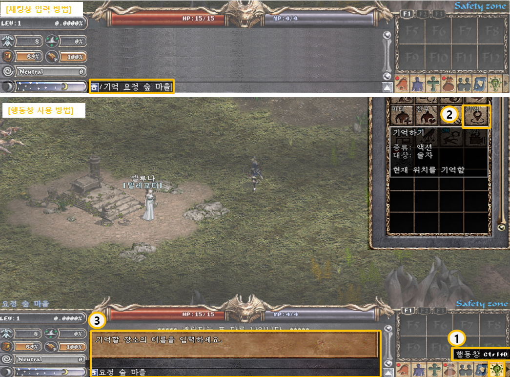 명령어 및 저장: 채팅창에 /기억 [장소이름]을 입력하면 현재 캐릭터가 서 있는 좌표가 저장됩니다.
