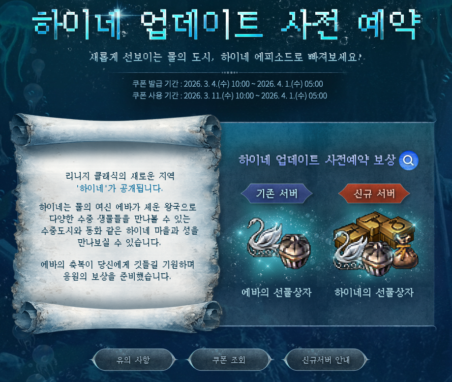 기존 서버 유저 보상 수중 던전 필수 아이템인 '인나드릴의 인장(7일)'과 소모품 및 수룡/인어 비늘을 획득할 수 있는 '인나드릴의 보물상자(30회)'가 지급됩니다. 이는 기존 상위권 유저들이 하이네 콘텐츠에 빠르게 적응하도록 돕는 구성입니다.
