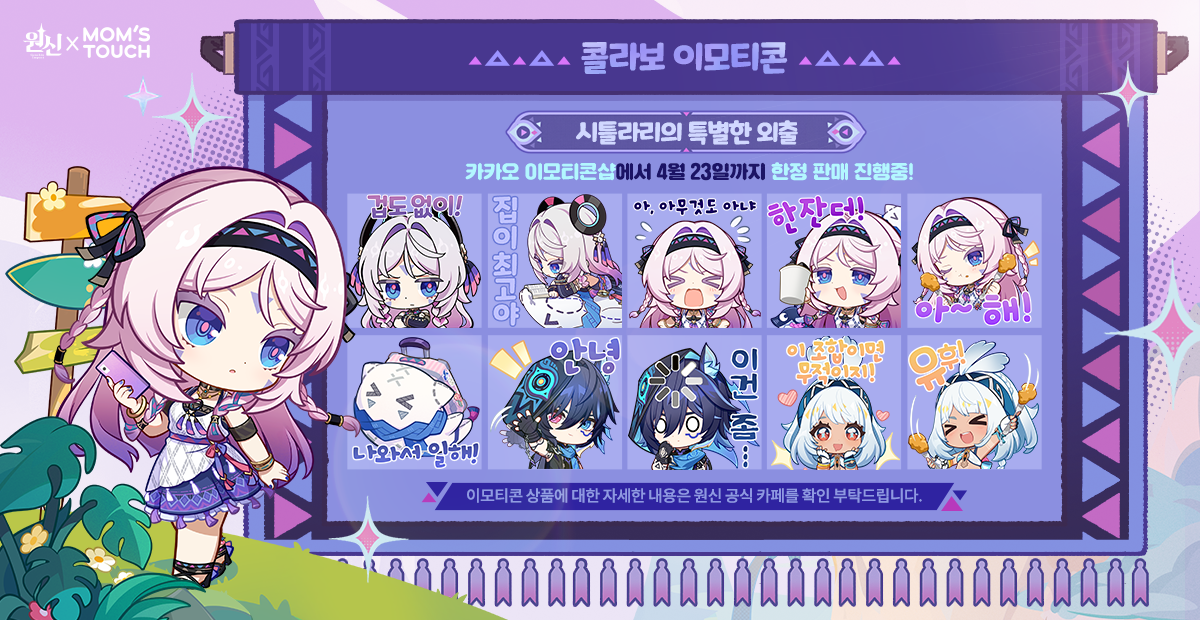 이번 콜라보의 꽃이라고 할 수 있는 디지털 콘텐츠 소식입니다. 시틀라리, 말라니, 올로룬이 등장하는 귀여운 이모티콘 24종이 출시되었습니다.