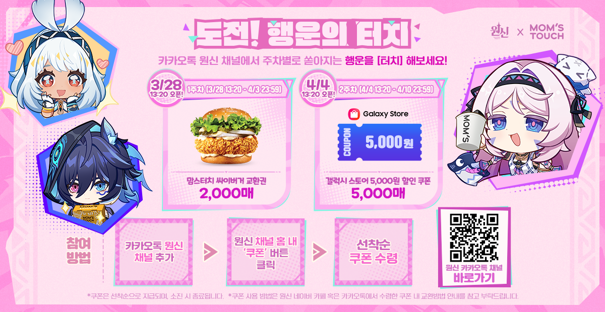 무료 카톡 테마: 원신 카카오톡 채널을 추가한 뒤 챗봇에게 맘스터치 콜라보 기념 테마를 검색하면 한정판 테마를 무료로 내려받을 수 있습니다. 4월 24일까지만 제공되니 서두르세요.