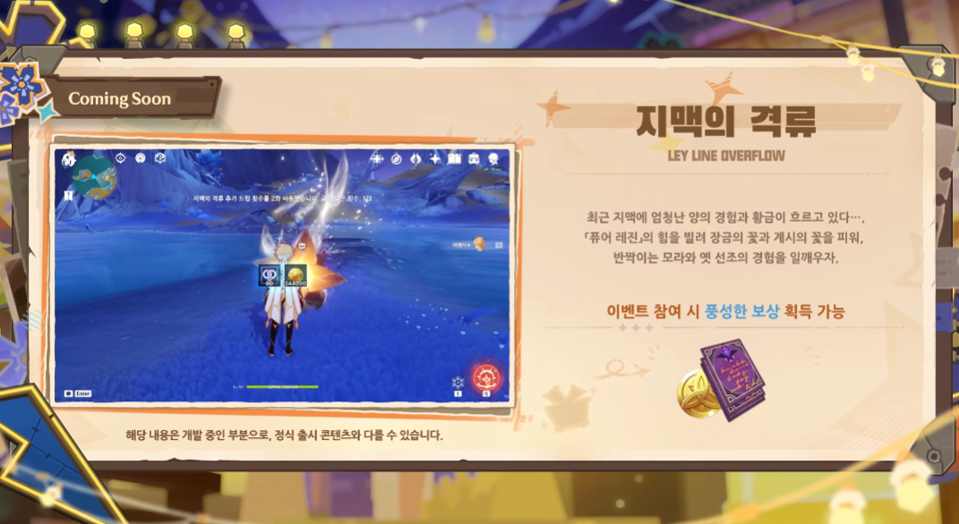 영상에서는 업데이트 직후부터 순차적으로 열리는 다양한 이벤트들이 소개되었습니다. 원신 특유의 다채로운 미니게임과 전투 챌린지가 포함되어 있으며, 이를 통해 성장에 필요한 필수 재화들을 대량으로 획득할 수 있습니다.